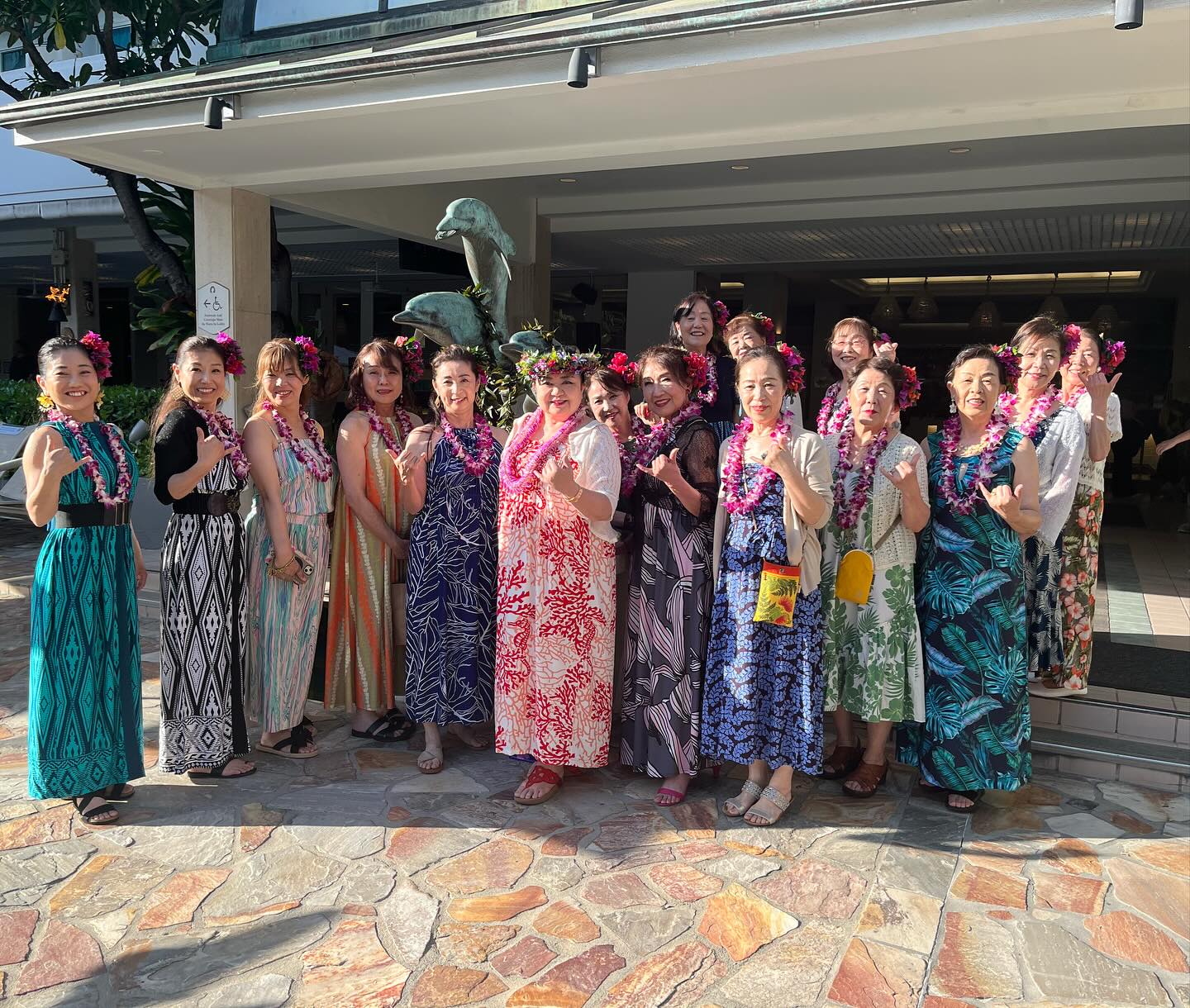 クムのワークショップを終えた後はカニカピラグリルへ。ワークショップで作ったブーゲンビリアの髪飾りとデンファレをつけていざ主宰とJohn Sanの還暦祝いパーティへ!